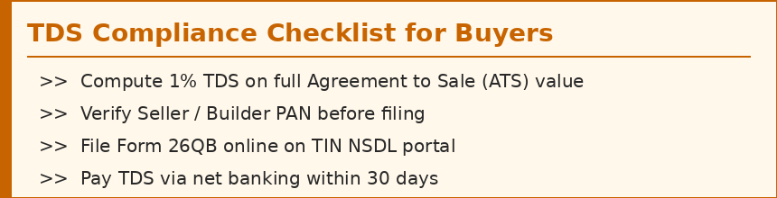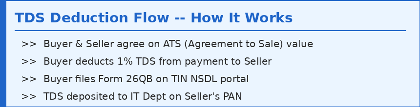 "The Buyer must deduct 1% TDS on the total deal value and deposit it to the Income Tax Department on the Seller's PAN — irrespective of whether the builder payment is pending or not."